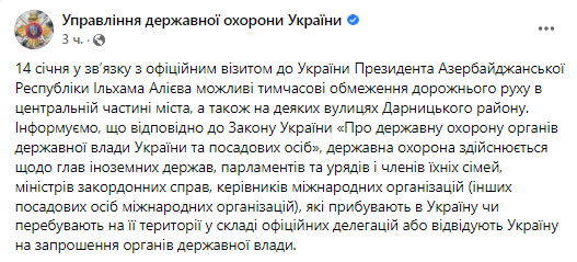 В связи с официальным визитом главы Азербайджана в Киеве возможны временные ограничения дорожного движения в центральной части города, а также на некоторых улицах Дарницкого района, сообщает Управление госохраны.