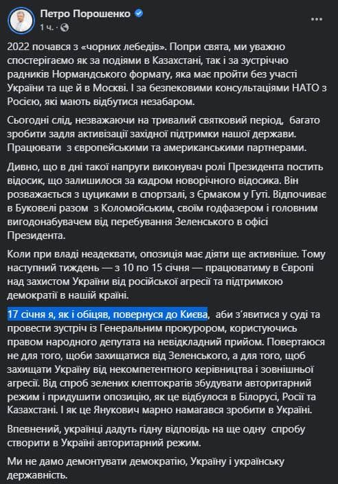 О своем возвращении в Киев глава "Евросолидарности" сообщил еще 6 января. Он написал в соцсетях, что приедет 17 января и примет участие в суде, а также встретится с генпрокурором - пользуясь правом депутата на неотложный прием.