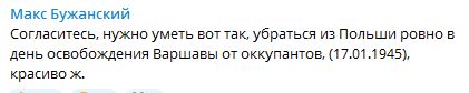 08:25 "Согласитесь, нужно уметь вот так, убраться из Польши ровно в день освобождения Варшавы от оккупантов, (17.01.1945), красиво ж", - подметил нардеп от "Слуги народа" Макс Бужанский.
