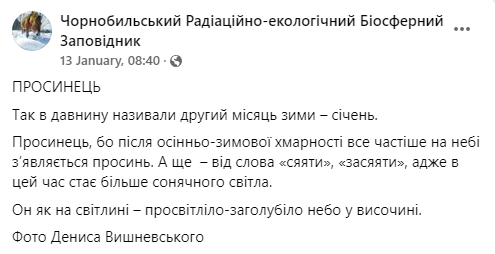 Сотрудники Чернобыльского радиационно-экологического биосферного заповедника в зоне отчуждения ЧАЭС рассказали, как в древности называли второй месяц зимы и опубликовали тематическое фото светло-голубого неба.