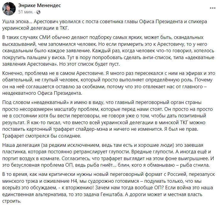 Волонтер Энрике Менендес тоже пишет, что интересен не сам по себе Арестович, а те, кто его назначил и заставил озвучивать разнообразные странные тезисы.