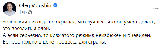 "Зеленский никогда не скрывал, что лучшее, что он умеет делать, это веселить людей. А если серьезно, то крах этого режима неизбежен и очевиден. Вопрос только в цене процесса для страны", - пишет депутат от ОПЗЖ Олег Волошин.