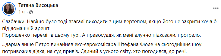 "Слабачки. Зачем тогда было вообще выходить с этим вертепом, если его не закрыть хотя бы под домашний арест. Порошенко одержал победу в этом туре. А правосудие, как мне точно подсказали, проиграло.