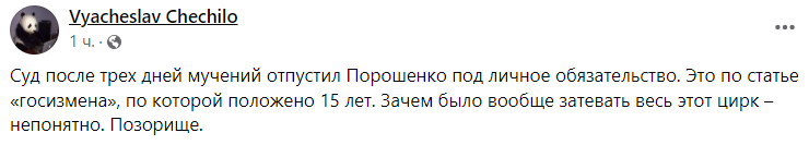 "Суд после трех дней мучений отпустил Порошенко под личное обязательство. Это по статье «госизмена», по которой положено 15 лет. Зачем было вообще затевать весь этот цирк – непонятно. Позорище", - пишет журналист Вячеслав Чечило.