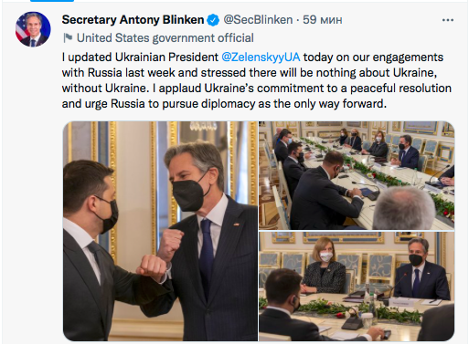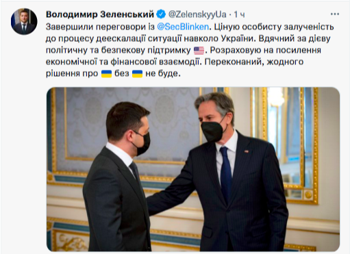 "Завершили переговоры с Энтони Блинкеном. Ценю личную вовлеченность в процесс деэскалации ситуации вокруг Украины. Благодарен США за действенную политическую поддержку и поддержку безопасности. Рассчитываю на усиление экономического и финансового взаимодействия. Убежден, что никакого решения об Украине без Украины не будет", — написал Зе.