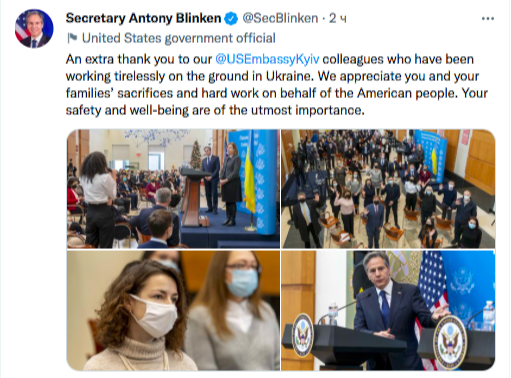 "Отдельное спасибо коллегам из Посольства США в Украине, которые неустанно работают здесь. Мы ценим жертвы и тяжелый труд вас и ваших семей во имя американского народа. Ваша безопасность и благополучие имеют первостепенное значение", — написал Блинкен в Твиттере.