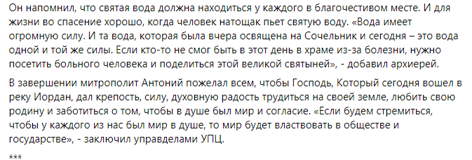 "Освященная вода - она как бы обновляется, преображается и вновь получает ту силу, которая дает нам жизнь. Каждый человек в этот день приходит в храм Божий, чтобы получить эту святыню. Она так и называется - большая Агиасма. Это великая святыня. И каждый человек в этот день освящает свой дом, и даже домашних животных, святой водой", - объяснил владыка.