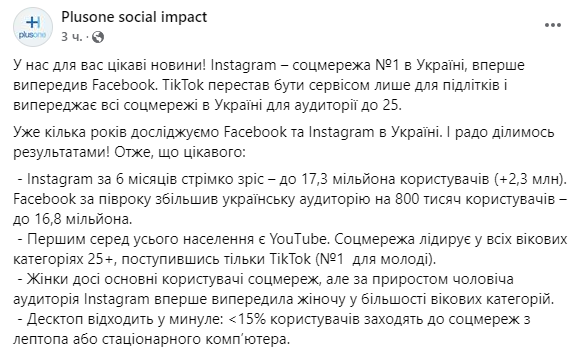 По данным исследования, за последние полгода украинская аудитория Instagram выросла на 2,3 миллиона пользователей и составляет 17,3 миллиона человек.