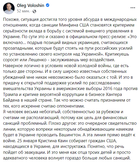 Я человек весьма небогатый, собственностью за рубежом и счетами не располагающий, потому как цель для финансовых санкций проблемный. Плохо другое: это очередное свидетельство линии, которую вопреки некоторым обнадеживающим намекам будет в Украине проводить Вашингтон. А эта линия прямо ведет к войне. 25 января Кристина Квин собирает граждан США, находящихся в Украине, для инструктажа. Понятно, что речь пойдет об эвакуации. И это меня как отца троих детей и просто адекватного человека волнует гораздо больше любых санкций".