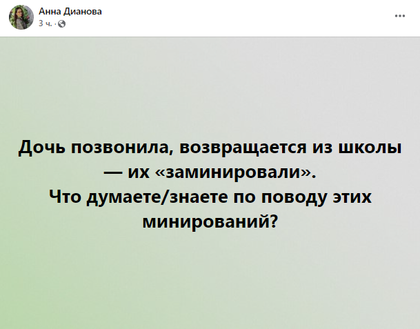 "Дочь позвонила, возвращается из школы - их "заминировали". Что думаете/знаете по поводу этих минирований", - интересуется в Facebook киевлянка Анна Дианова.