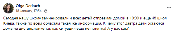 "Сегодня нашу школу заминировали, и всех детей отправили домой в 10:00 и еще 48 школ Киева, также по всем областям такая же информация. К чему это? Завтра дети остаются дома на дистанционке, так как ситуация еще не понятна! А у вас как?", - интересуется Ольга Деркач.
