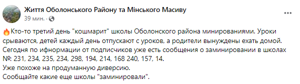 "Кто-то третий день "кошмарит" школы Оболонского района минированиями. Уроки срываются, детей каждый день отпускают с уроков, а родители вынуждены ехать домой. Сегодня, по информации от подписчиков, уже есть сообщения о заминировании в школах №: 231, 234, 235, 234, 298, 194, 214, 168 240, 157, 14. Уже похоже на продуманную диверсию. Сообщайте, какие еще школы "заминировали", - информируют подписчиков в киевской группе "Жизнь Оболонского района и Минского массива".
