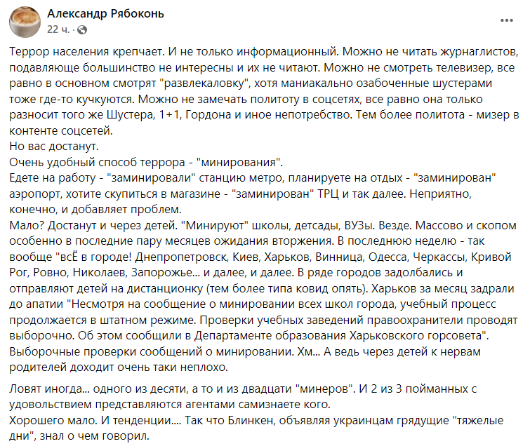 Мало? Достанут и через детей. "Минируют" школы, детсады, вузы. Везде. Массово и скопом особенно в последние пару месяцев ожидания вторжения. В последнюю неделю - так вообще "всЁ в городе! Днепропетровск, Киев, Харьков, Винница, Одесса, Черкассы, Кривой Рог, Ровно, Николаев, Запорожье... и далее, и далее. В ряде городов задолбались и отправляют детей на дистанционку (тем более типа ковид опять). Харьков за месяц задрали до апатии "Несмотря на сообщение о минировании всех школ города, учебный процесс продолжается в штатном режиме. Проверки учебных заведений правоохранители проводят выборочно. Об этом сообщили в Департаменте образования Харьковского горсовета".