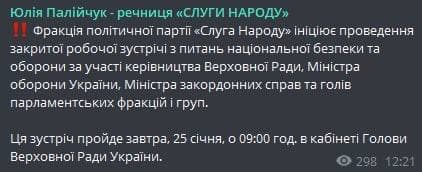 Фракция "Слуга Народа" завтра, 25 января, проведет закрытую рабочую встречу по вопросам национальной безопасности и обороны с участием руководства Верховной Рады, Министра обороны, министра иностранных дел и глав парламентских фракций и групп.