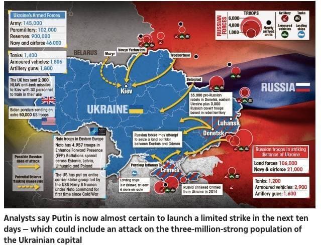 Британский таблоид The Sun, ссылаясь на "аналитиков", написал о том, что российский президент Владимир "Путин почти наверняка нанесет ограниченный удар в ближайшие десять дней, который может включать в себя нападение на трехмиллионное население украинской столицы".