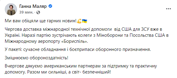 В Украину прибыла новая, уже третья, партия помощи США для украинских военных. В нее входит современное оборудование и боеприпасы оборонного назначения. Об этом сообщает заместитель министра обороны Украины Анна Маляр.