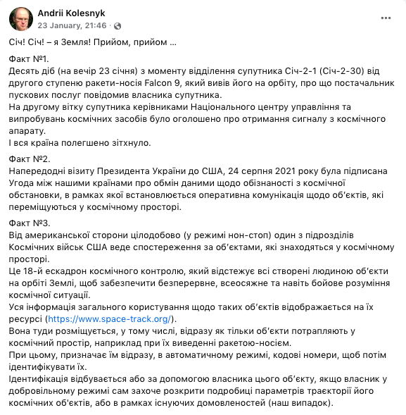 23 января бывший советник главы Государственного космического агентства Украины Андрей Колесник написал в Facebook, что по прошествии десяти дней после запуска "Сич" до сих пор не вышел на связь.