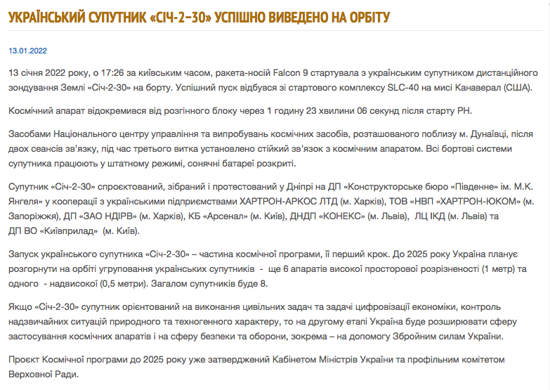 13 января, впервые за 11 лет, был запущен украинский спутник "Сич‑2‑30". За мероприятием, проходившим в США, следил президент Зеленский. Однако, по последним данным, космический объект не выходит на связь.