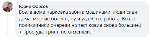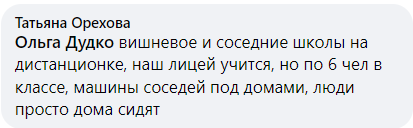 "Школы на дистанционке, наш лицей учится, но по 6 человек в классе, машины соседей под домами, люди просто дома сидят", "Много школ/классов на дистанционном обучении", "Возле дома парковка забита машинами, люди сидят дома, многие болеют, ну и на удаленке работа. Возле поликлиники очереди на тест ковид снова большие. Плюс простуду и грипп не отменяли", - пишут пользователи.
