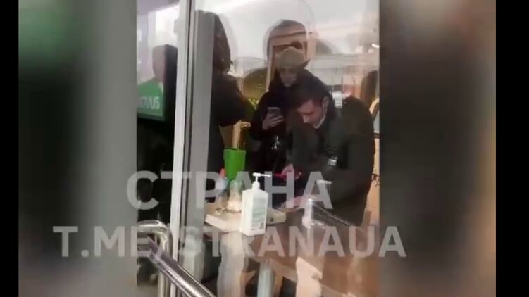 На кадрах видно, как молодой парень берет данные банковских карточек участников акции и вносит их в свой телефон. То же самое делают двое других мужчин. После этого один из них идет к платежному терминалу IBOX и осуществляет оплату на карты.