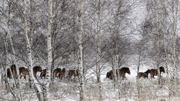 Сотрудники Чернобыльского радиационно-экологического биосферного заповедника в зоне отчуждения ЧАЭС показали фото табуна лошадей Пржевальского, которые пасутся на снегу среди берез.