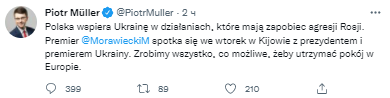 "Польша поддерживает Украину в предотвращении агрессии России. Премьер-министр Моравецкий встретится во вторник в Киеве с президентом и премьер-министром Украины. Мы сделаем все возможное, чтобы сохранить мир в Европе", - говорится в сообщении.