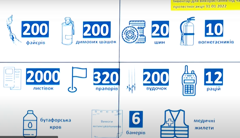 Глава Нацполиции Игорь Клименко добавил, что первую акцию протеста планировали устроить прямо сегодня, 31 января, у Офиса президента. Там планировали устроить "спектакль" с бутафорской кровью и якобы ранением одного из участников митинга. А также столкновения с полицией.
