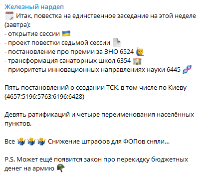 Во вторник, 1 февраля, Верховная Рада передумала заниматься законопроектом о штрафах для ФОПов за отстутствие РРО и направит свои усилия на принятие постановления о премиях за ВНО и переименование населенных пунктов. Об этом сообщил нардеп "Голоса" Ярослав Железняк в своем Тelegram-канале.