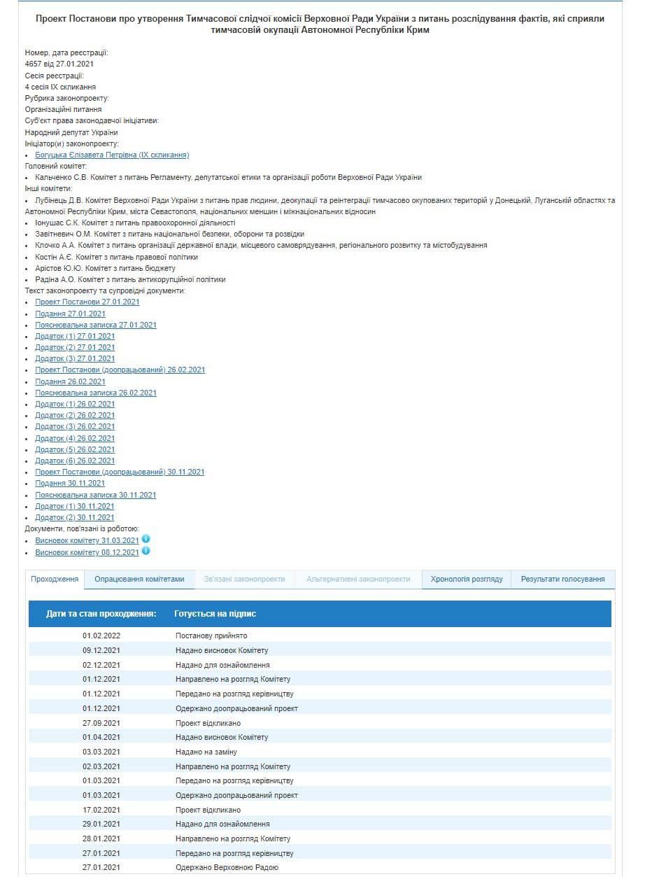 Проект постановления о создании временной следственной комиссии (ВСК) по вопросам расследования фактов, которые способствовали временной оккупации Крыма, Комитет по вопросам регламента, депутатской этики и организации работы Верховной Рады Украины поддержал еще в марте прошлого года. Соответствующий проект постановления нардеп Елизавета Богуцкая внесла на рассмотрение 27 января 2021 года.