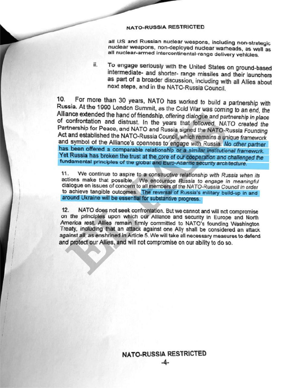 Важный пункт предложения НАТО - "Россия выводит войска из Украины, Грузии и Молдавии, где они были развернуты без согласия принимающей стороны". Отметим, что этой формулировки нет в ответе США. И это показательный момент. То есть Вашингтон не ставит Москве заведомо невыполнимых условий и не увязывает их с остальными пунктами своих предложений.