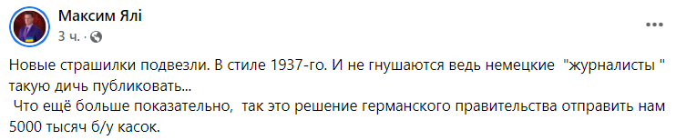 Что ещё больше показательно, так это решение германского правительства отправить нам 5000 тысяч б/у касок", - пишет политолог-международник Максим Яли.