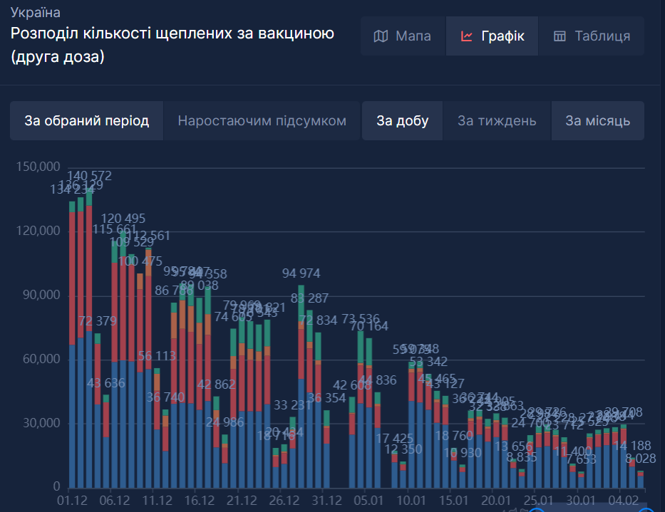 Казалось бы, украинцы еще в конце декабря или начале января, узнав о "Вовиной тысяче", должны были ринуться на прививку и ближе к февралю прийти за второй дозой. Но никакого роста вакцинаций не замечено. Аналогичная картина и по первым дозам.