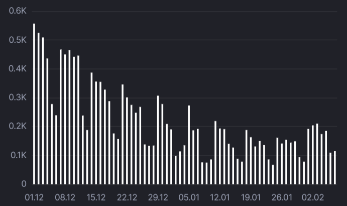 При этом смертность от ковида идет на спад - что также отвечает общемировым тенденциям. Она опускалась весь декабрь и январь, и только в начале февраля спад прекратился и стабилизировался на отметке 100-200 человек в день.