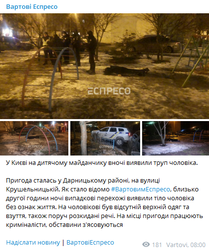 Ранее мы писали, что в понедельник, 17 января, в Киеве возле станции метро "Вокзальная" обнаружили окровавленный труп мужчины. По информации правоохранителей мужчине стало плохо и он умер до приезда медиков.