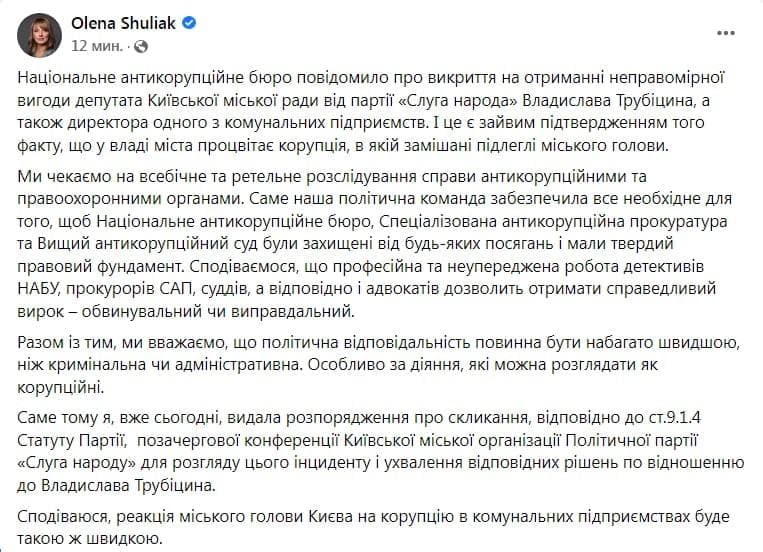 Также она сообщила, что сегодня распорядилась созвать внеочередную конференцию Киевской городской организации "Слуги народа" для рассмотрения инцидента и принятия решения по отношению к Трубицину.