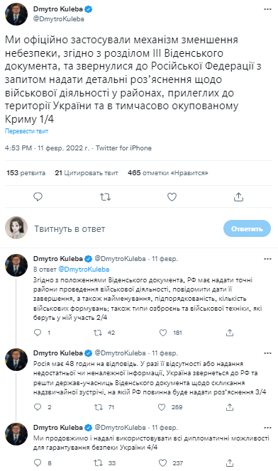 "Россия имеет 48 часов на ответ. В случае ее отсутствия или предоставления недостаточной или ненадлежащей информации, Украина обратится в РФ и другие государства-участники Венского документа о созыве чрезвычайной встречи, на которой Россия должна будет предоставить разъяснение", - резюмировал Кулеба.