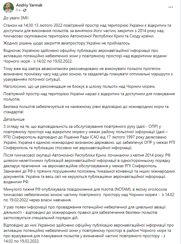 "Отметим, что эта рекомендация не блокирует в целом полеты над Черным морем. Воздушное пространство над территорией Украины является открытым и доступным для планирования полетов. Безопасность полетов обеспечивается на должном уровне в соответствии с международными нормами и стандартами!", - написал он.