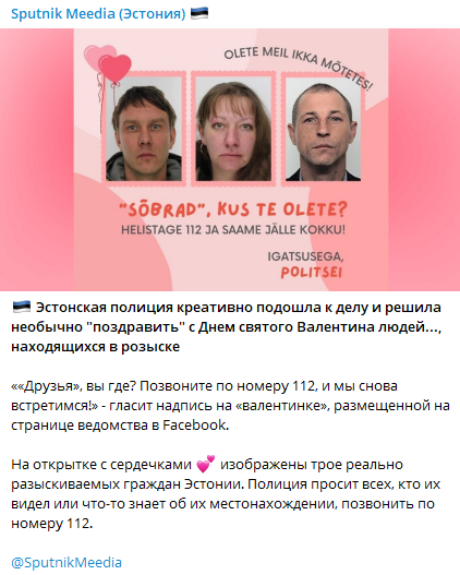 Эстонская полиция креативно "поздравила" с Днем святого Валентина людей, которые находятся в розыске, опубликовав в соцсети "валентинку" с обращением к ним.