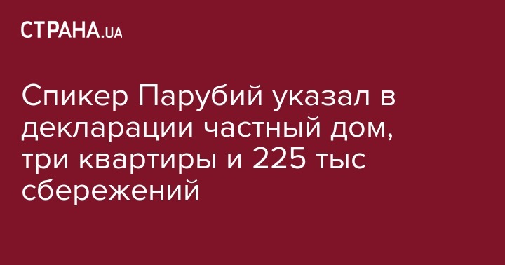 В декларации Парубий указал, что его супруга Ульяна владеет квартирой площадью 21,60 квадратных метров, которая расположена во Львове, а также земельным участком площадью 1130 квадратных метров. Во Львове у нее значится еще одна квартира площадью 142,60 квадратных метров.