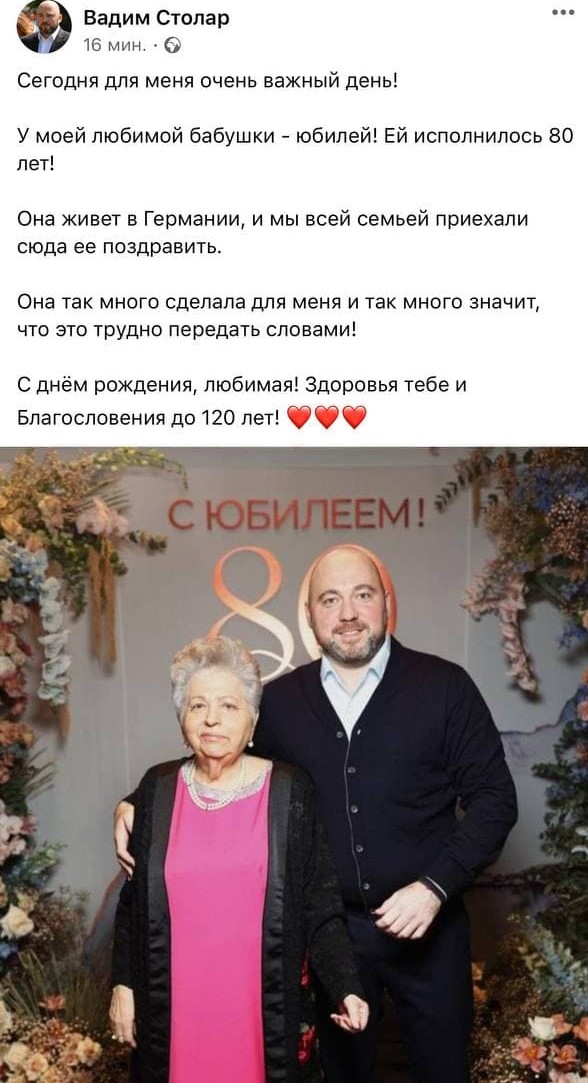 Нардеп Вадим Столар опубликовал фото со своей бабушкой. Написал, что она живет в Германии, ей исполнилось 80 лет и потому нардеп со всей семьей приехал ее поздравить.