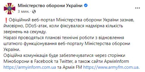 15 февраля перестал открываться и сайт Минобороны Украины. При попытке зайти на страницу пользователю сообщалось об отсутствии доступа к сайту.