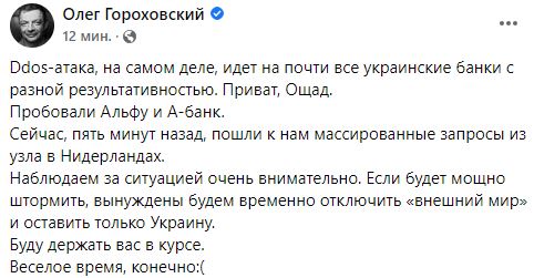 "Приват, Ощад. Пробовали Альфу и А-банк. Сейчас, пять минут назад, пошли к нам массированные запросы из узла в Нидерландах. Наблюдаем за ситуацией очень внимательно. Если будет мощно штормить, вынуждены будем временно отключить "внешний мир" и оставить только Украину. Буду держать вас в курсе. Веселое время, конечно" - написал Гороховский.