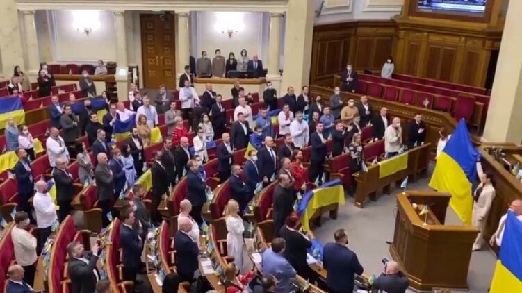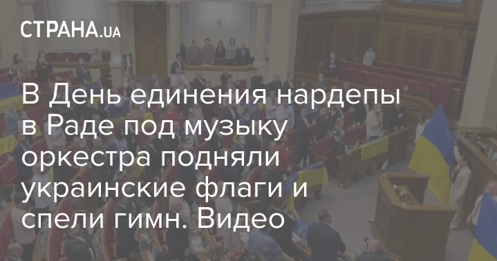 В среду, 16 февраля, в Верховной Раде Украины, где проходит пленарное заседание, празднуют День единения. Народные депутаты под сопровождение оркестра спели гимн Украины и подняли украинские флаги.