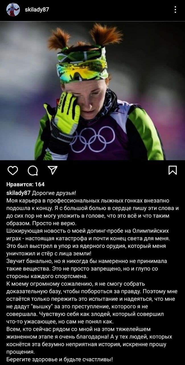 "Моя карьера в профессиональных лыжных гонках внезапно подошла к концу. Я с большой болью в сердце пишу эти слова и до сих пор не могу уложить в голове, что это всё и что таким образом. Просто не верю. Шокирующая новость о моей допинг-пробе на Олимпийских играх - настоящая катастрофа и почти конец света для меня. Это был выстрел в упор из ядерного орудия, который меня уничтожил и стёр с лица земли", - написала девушка.