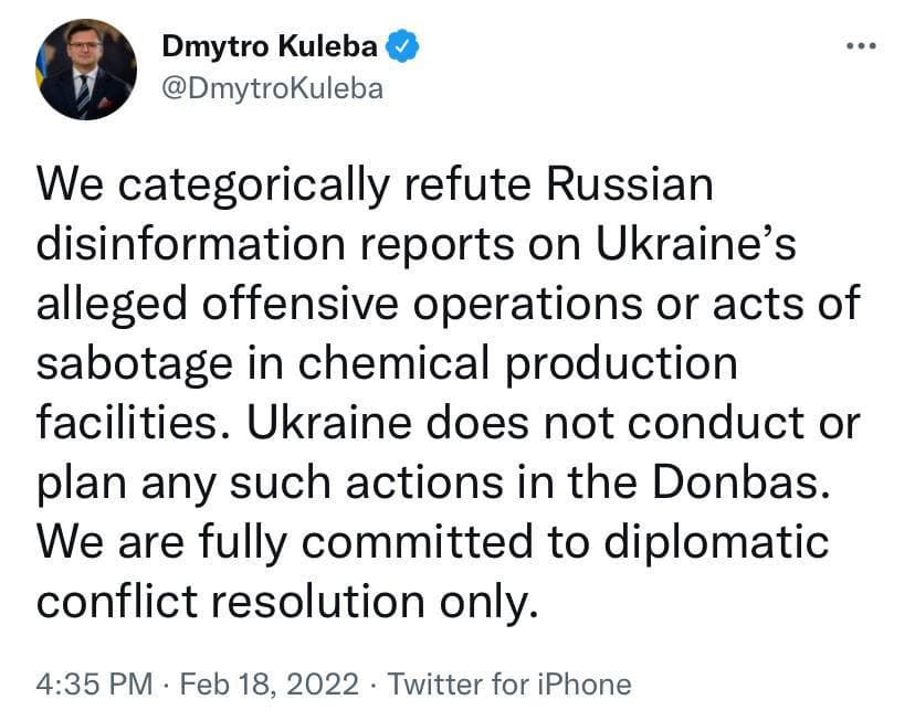 "Категорически отвергаем российские дезинформационные сообщения о предполагаемых наступательных операциях Украины или актах саботажа на объектах химического производства. Украина не проводит и не планирует подобных действий на Донбассе. Мы полностью привержены исключительно дипломатическому разрешению конфликтов", - написал Кулеба.
