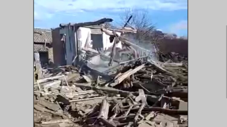 На видео можно заметить развалины дома, которые еще дымят, а также части снаряда.