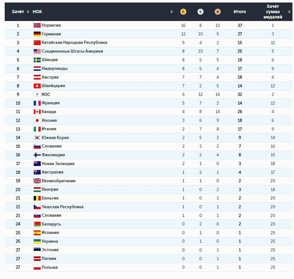 По итогам зимней Олимпиады-2022 в Пекине первое место занимает Норвегия, у нее 37 медалей. На втором и третьем месте оказались Германия (27 медалей) и Китай (15 медалей).