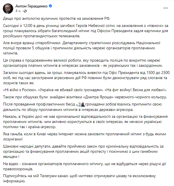 Советник главы Министерства внутренних дел Украины Антон Геращенко заявил, что Национальная полиция разоблачила организаторов заказного митинга, который сегодня должен был пройти у Офиса президента.