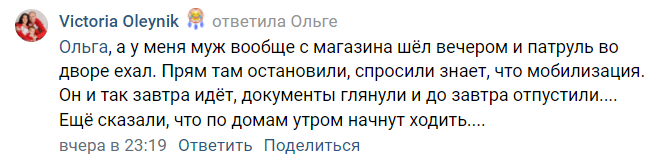 "У меня муж из магазина шёл вечером, и патруль во дворе ехал. Прямо там остановили, спросили знает ли, что мобилизация. Он и так завтра идёт в военкомат, документы глянули и до завтра отпустили. Ещё сказали, что по домам утром начнут ходить", - рассказывает в одной из донецких групп дончанка Виктория Олейник.
