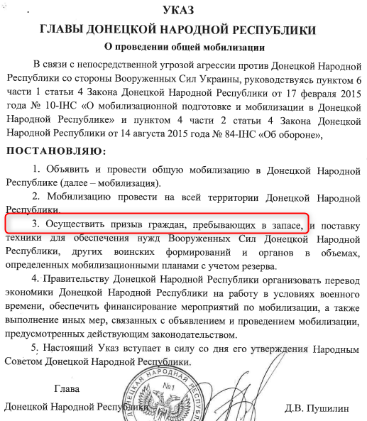 У Пушилина относительно жителей сказано одно: "Осуществить призыв граждан, пребывающих в запасе". Также указано, что мобилизация общая - кроме нее в "республике" бывает и частичная.